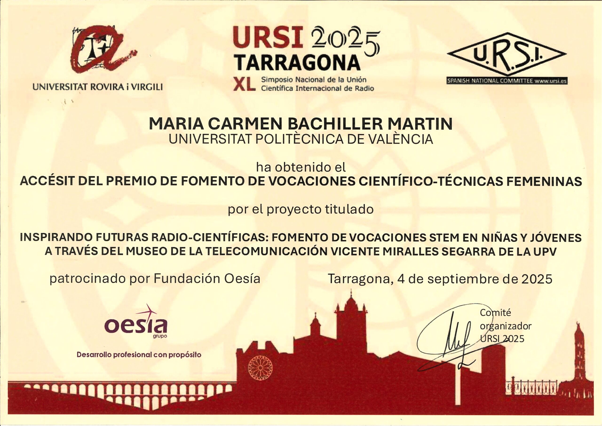El pasado 4 de septiembre en Tarragona, El Museo de la Telecomunicación Vicente Miralles Segarra recibió un Accesit del Premio de Fomento de Vocaciones Científico- Técnicas Femeninas en la 2º edición del Premio WIRS (Woman In Radio Science) otorgado por URSI-España 2025, en colaboración con la Cátedra Grupo Oesía de la Universida de de Vigo, por nuestro proyecto «Inspirando Futuras Radio-Científicas: Fomento de Vocaciones STEM en niñas y jóvenes a través del Museo de la Telecomunicación Vicente Miralles Segarra de la UPV».