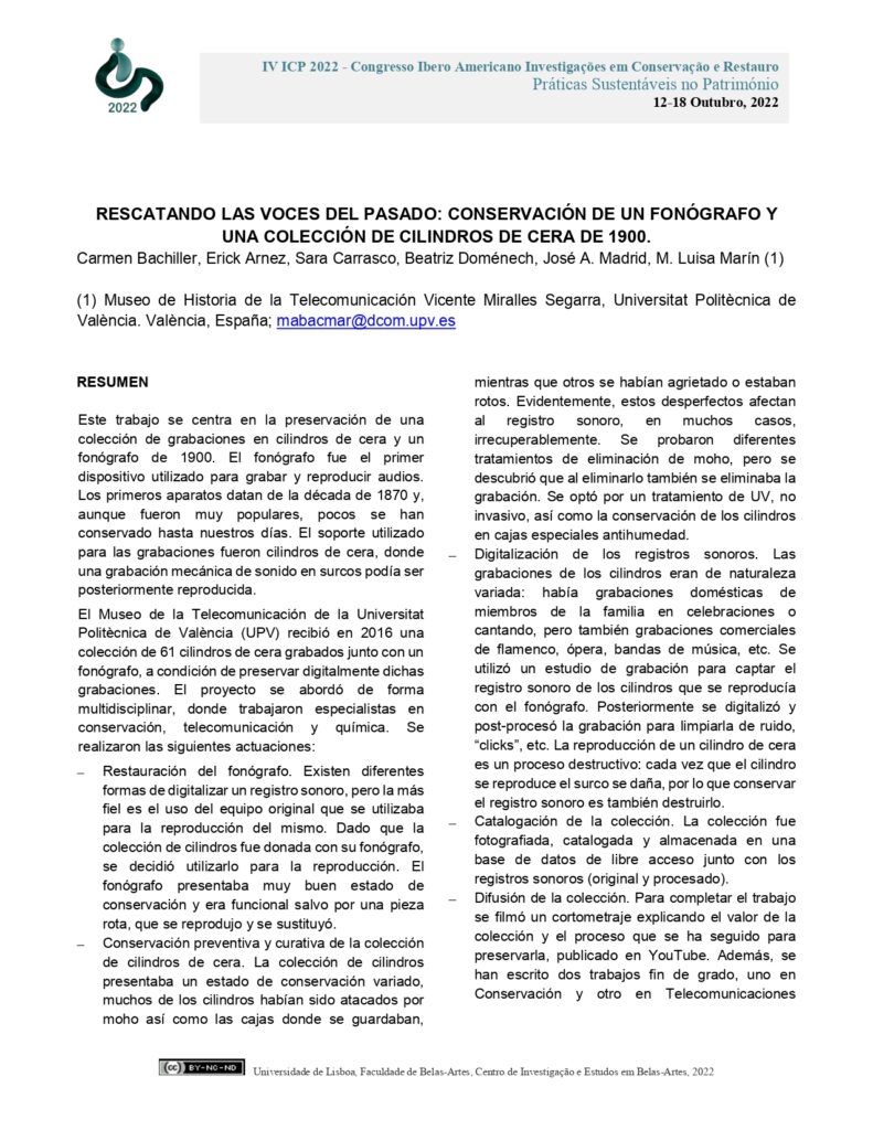 Este artículo, publicado en las actas del IV Congreso Ibero-Americano de Investigaciones en Conservación y Restauración (ICP 2022), celebrado en la Universidade de Lisboa—realizado por Carmen Bachiller, Erick Arnez, Sara Carrasco, Beatriz Doménech, José A. Madrid y M. Luisa Marín— documenta un proyecto de recuperación, conservación y digitalización de un fonógrafo de 1900 y una colección de 61 cilindros de cera con grabaciones históricas.