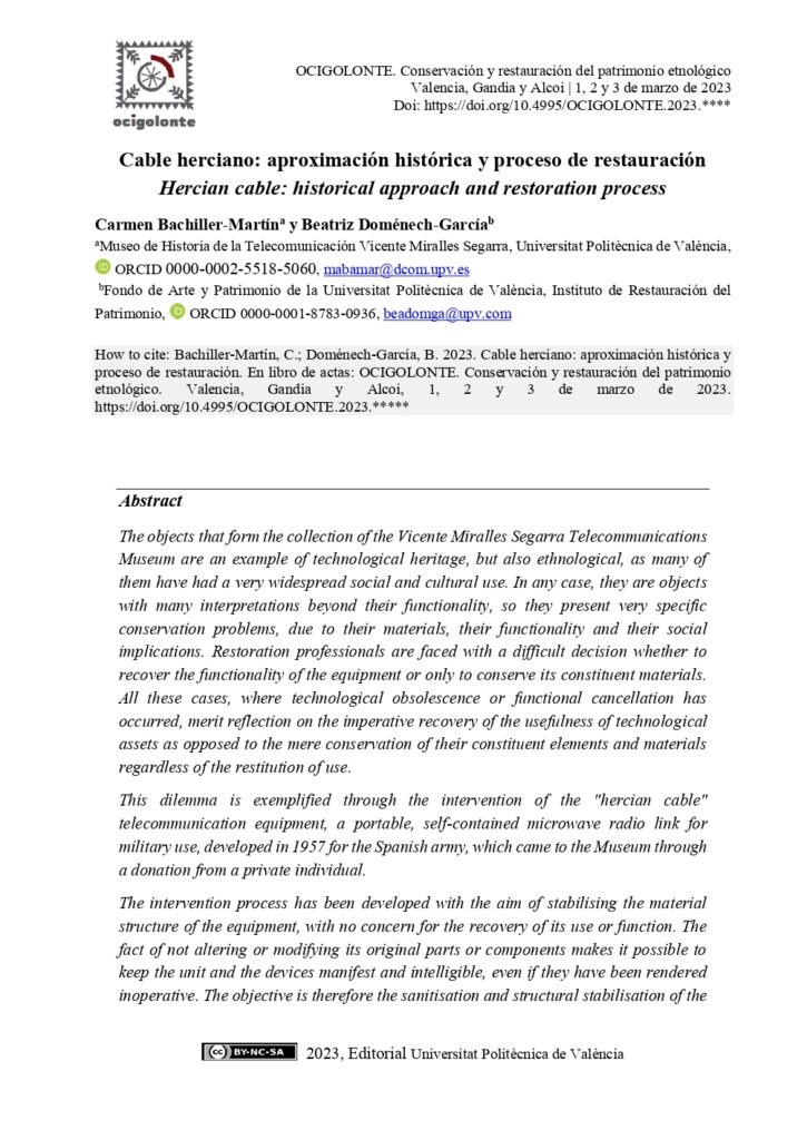 Artículo realizado por Carmen Bachiller (Directora del Museo de Telecomunicaciones Vicente Miralles Segarra), Beatriz Doménech (Área de Fondo de Arte y Patrimonio UPV) y Antoni Colomina (Director del Área de Fondo de Arte y Patrimonio UPV), para las actas de la 24ª Jornada de Conservación de Arte Contemporáneo, organizada por el Departamento de Restauración del Museo Reina Sofía y celebrada en febrero de 2023. En este artículo ponen en valor todas las acciones que el museo de telecomunicaciones realiza, abarcando: la investigación, difusión y conservación de su patrimonio tecnológico. Y en concreto, presentan los proyectos de conservación y restauración de 3 equipos de telecomunicaciones específicos del siglo XX: una emisora de radio civil, un transceptor militar y un cable herciano, este último entendido como un radioenlace portátil.