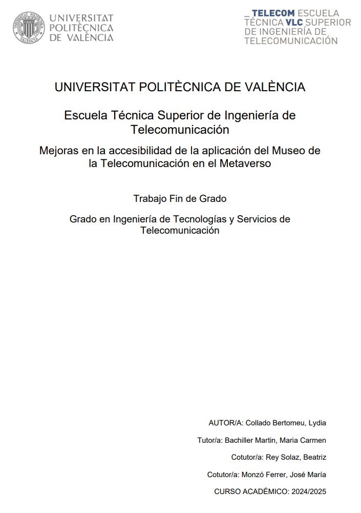 El presente proyecto tiene como objetivo analizar y mejorar la accesibilidad de la aplicación actual del Museo de la Telecomunicación, desarrollada en el entorno Spatial del Metaverso. Esta aplicación puede ser utilizada desde distintos dispositivos, como smartphones, ordenadores y gafas de realidad virtual, lo cual plantea importantes retos de accesibilidad.